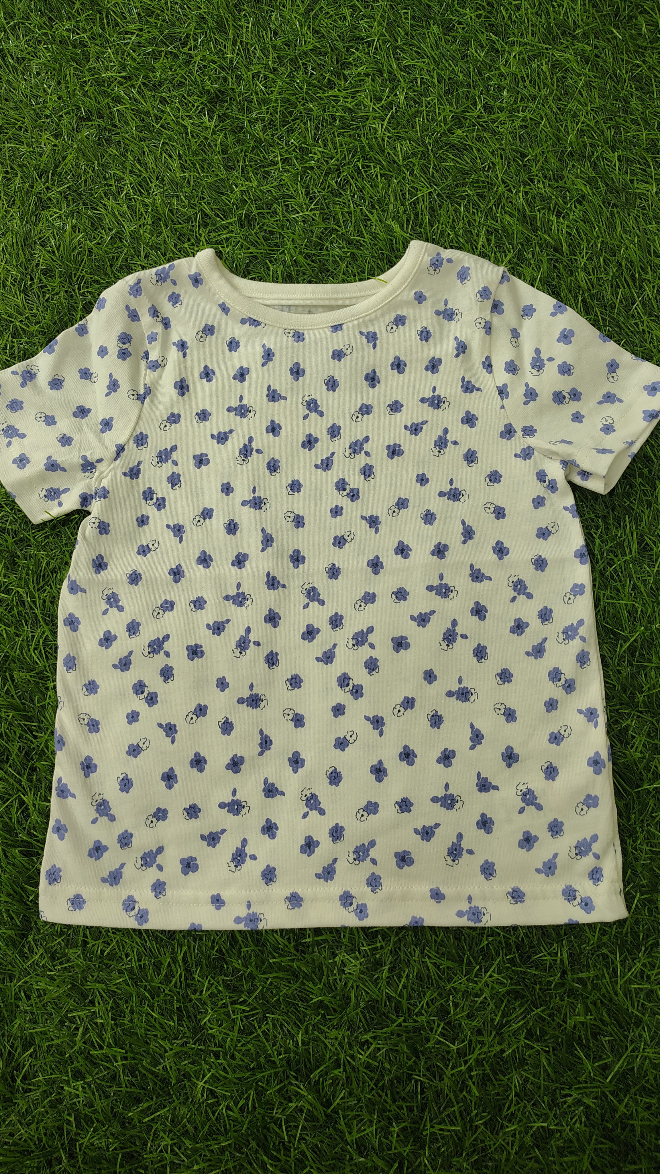 Add a touch of sweetness to your little girl’s wardrobe with this charming cream floral printed t-shirt. Featuring delicate blue mini flower prints all over, this top gives a soft, elegant and fresh look that’s perfect for everyday styling.
