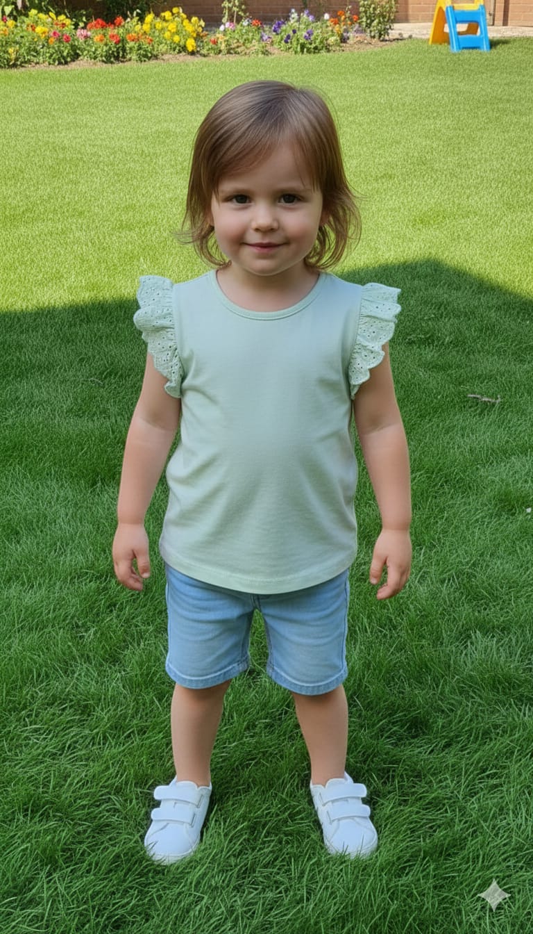 Add a soft and elegant touch to your little girl’s wardrobe with this beautiful pastel green cotton top. Designed with delicate flutter sleeves featuring eyelet lace detailing, this top gives a cute and stylish look. Made from soft and breathable cotton fabric, it ensures maximum comfort for all-day wear. The simple round neck and soothing colour make it perfect for casual outings, playtime, or special occasions.