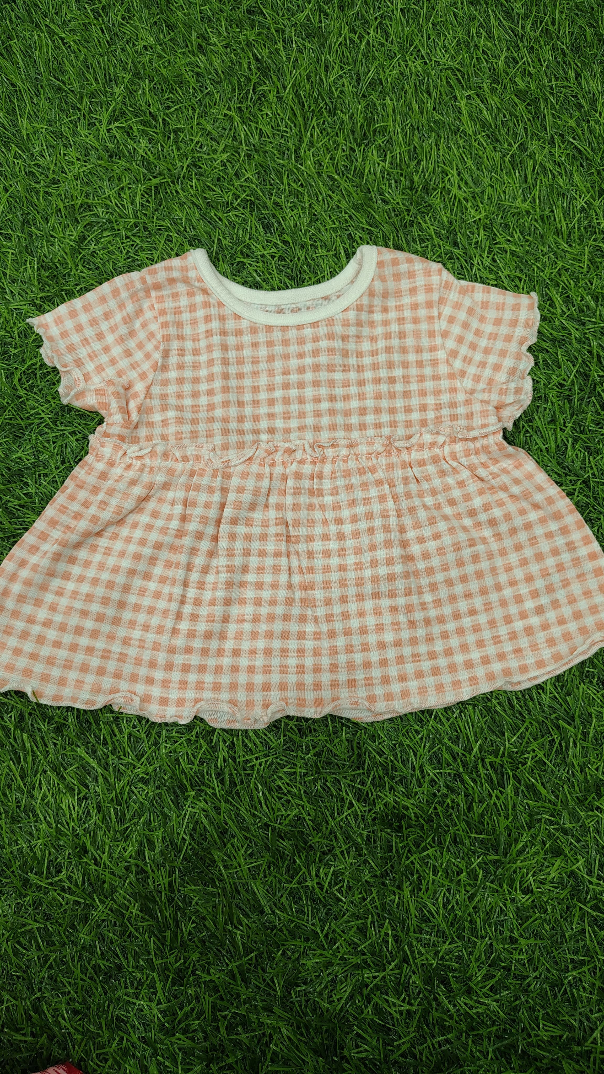 This adorable baby dress is made from soft, breathable fabric to keep your little one comfortable all day. Designed with a cute check pattern, short sleeves, and a gently gathered waist, it offers a relaxed fit with a charming look. Perfect for everyday wear, playtime, and casual outings.