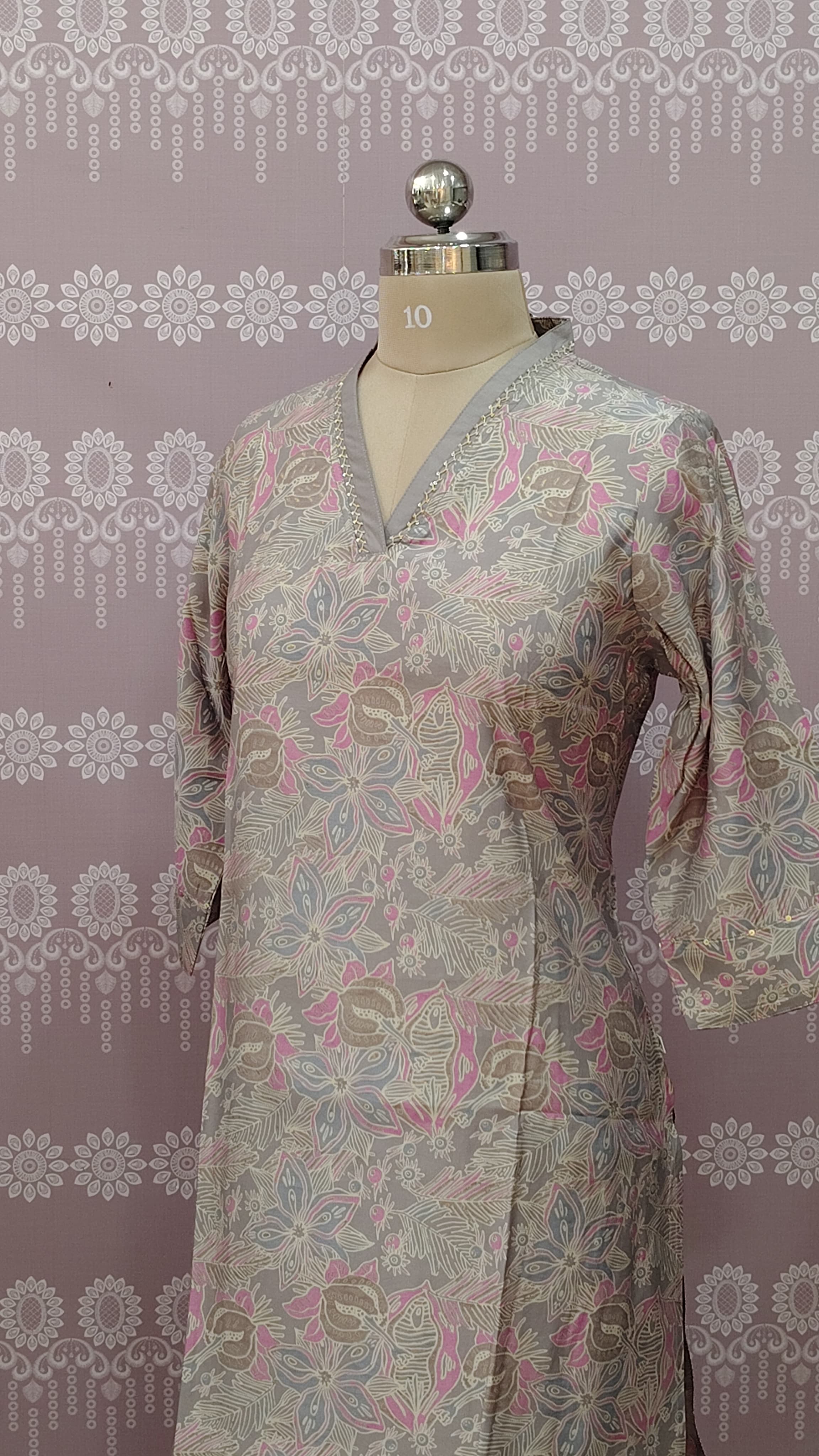 Graceful grey kurta set featuring soft pastel floral prints. The kurta comes with a stylish V-neck and three-quarter sleeves, paired with matching pants and a sheer, lightweight dupatta with delicate border detailing. Made from comfortable, breathable fabric, perfect for everyday wear, office use, and light festive occasions.