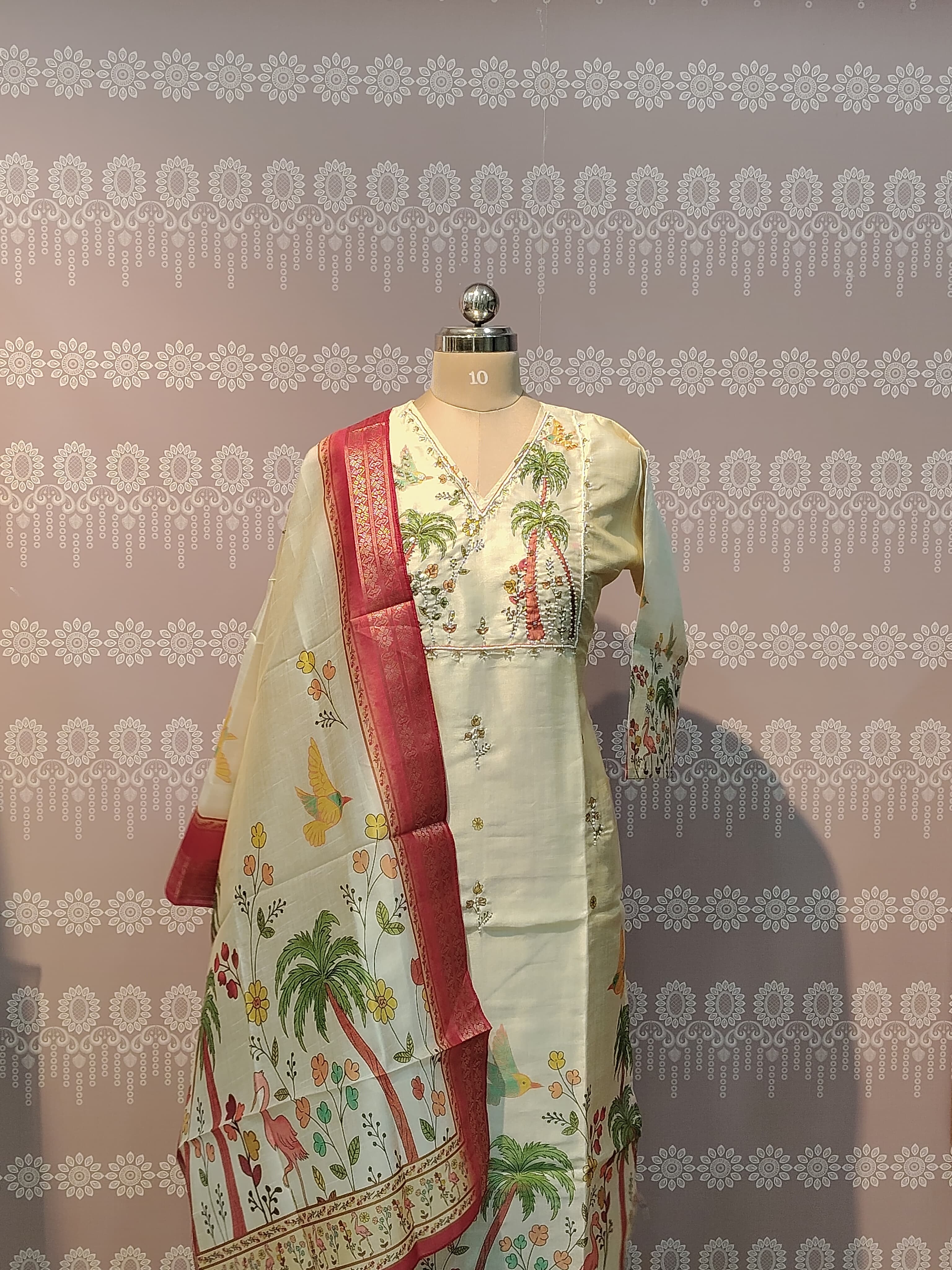 Step into effortless elegance with this beautiful cream ethnic set. The kurta features delicate nature-inspired prints with subtle detailing, giving it a graceful and timeless look. Paired with matching straight-fit pants for all-day comfort, the outfit is completed with a stunning dupatta highlighted by a rich maroon border that adds a touch of traditional charm. Perfect for festive occasions, casual gatherings, or daytime celebrations, this ensemble blends comfort with classic style beautifully.