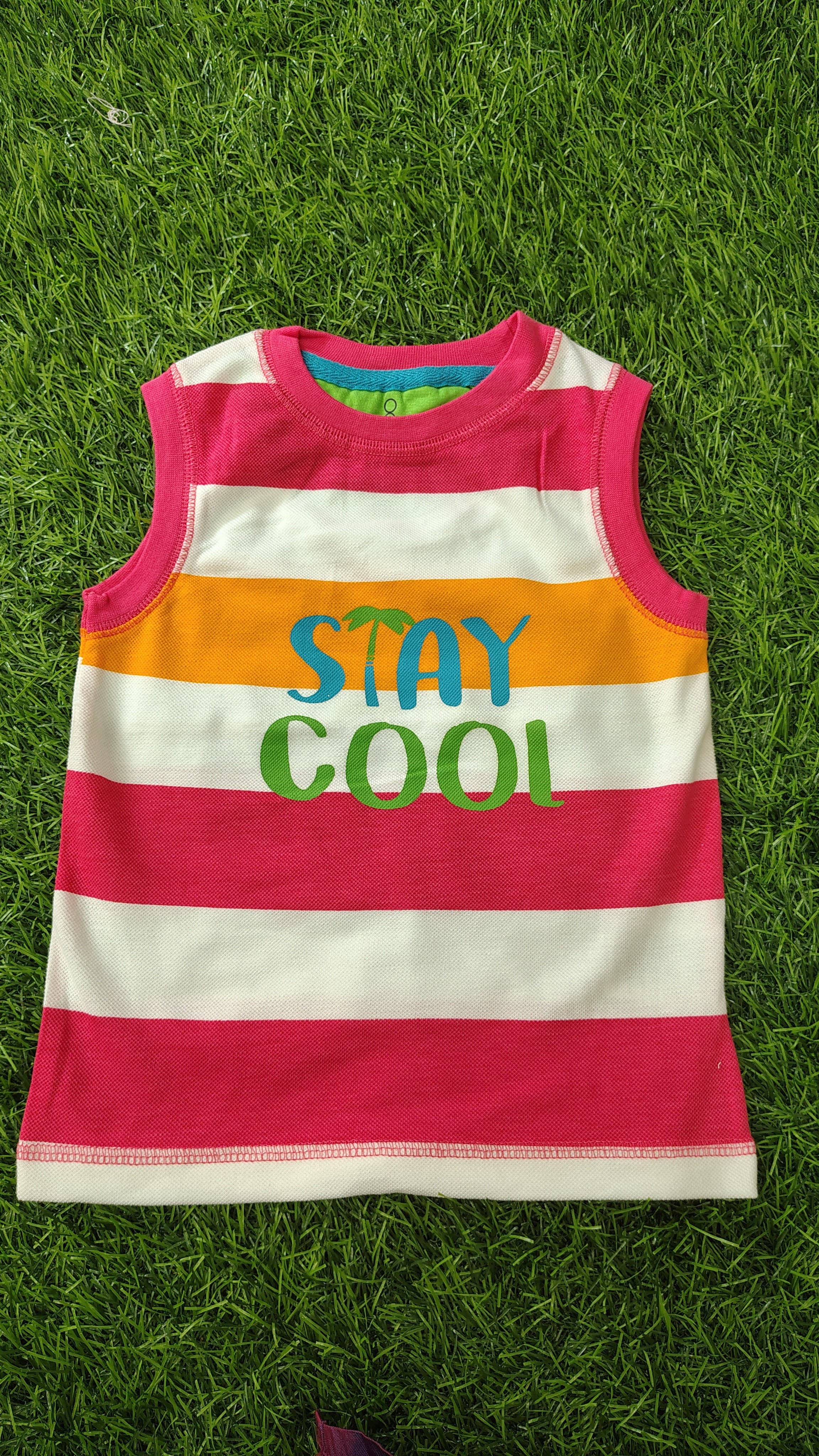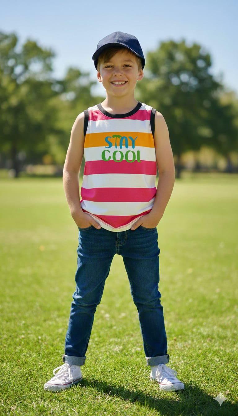 Keep your little one cool and comfy with this fun sleeveless top. Made from soft, breathable fabric, it features colorful stripes and a playful “Stay Cool” print on the front. Lightweight and easy to wear, this top is perfect for summer days, playtime, and casual outings.