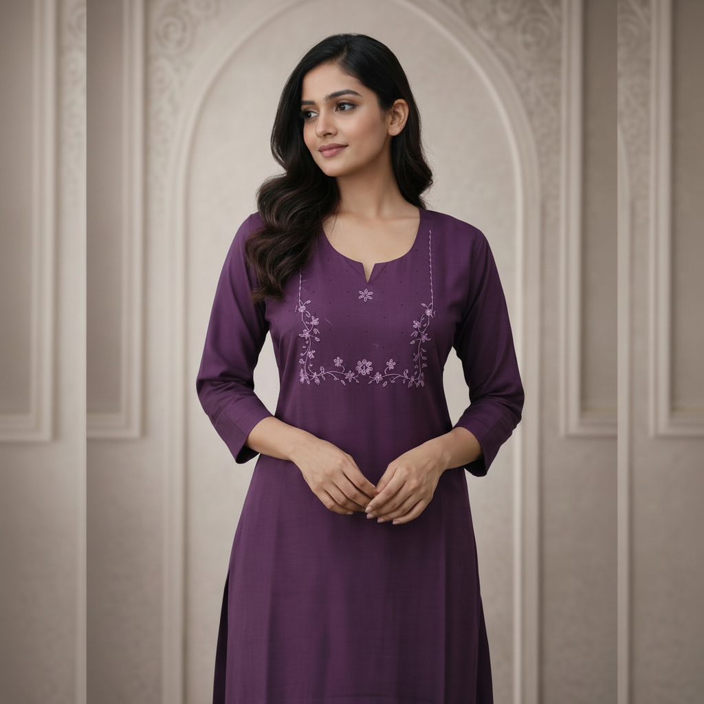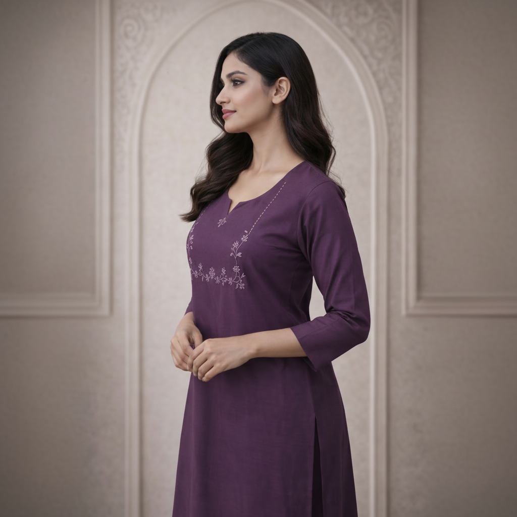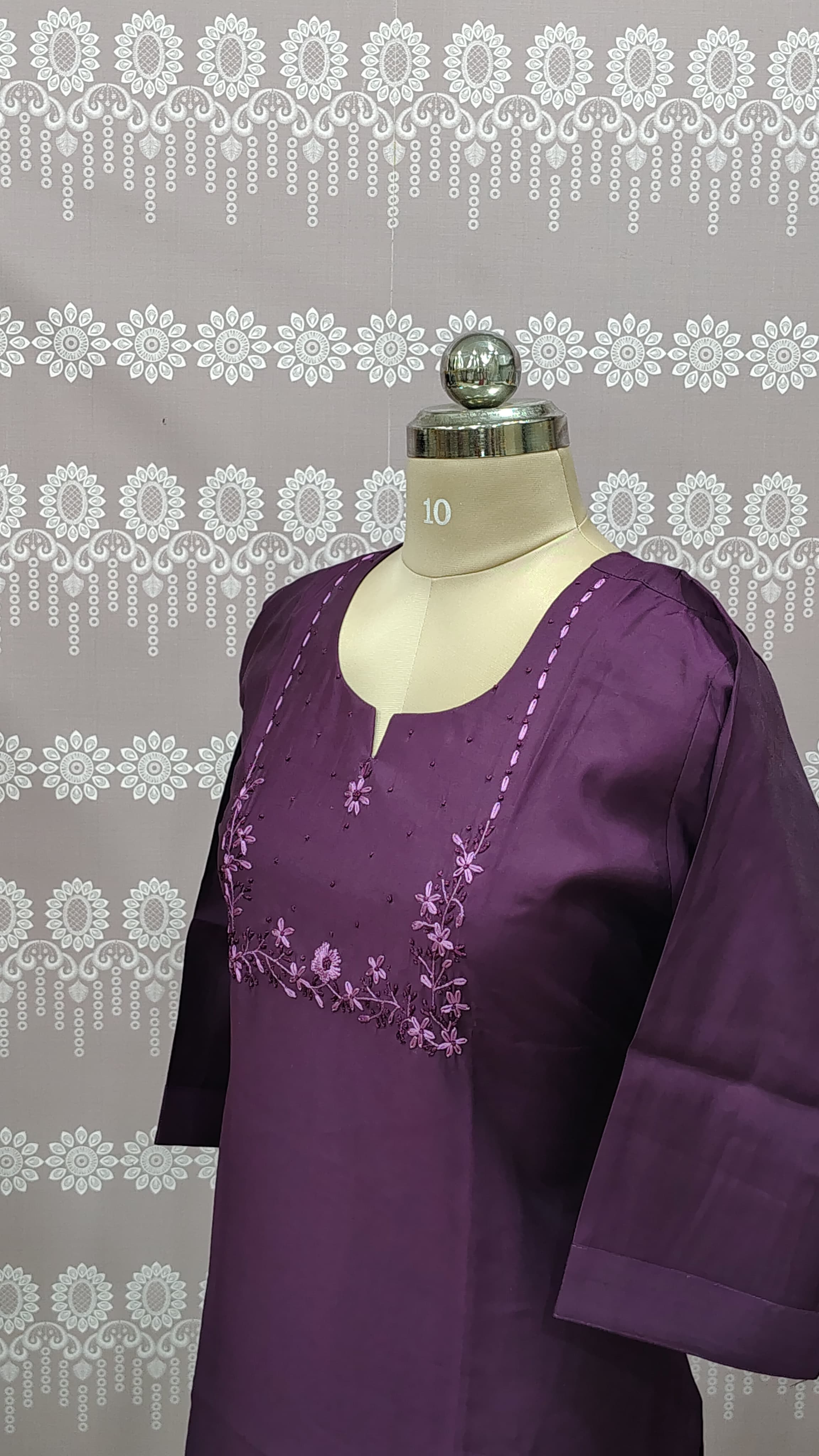 Embroidery: The chest area is highlighted with tonal floral threadwork (Resham embroidery) in a slightly lighter shade of purple.