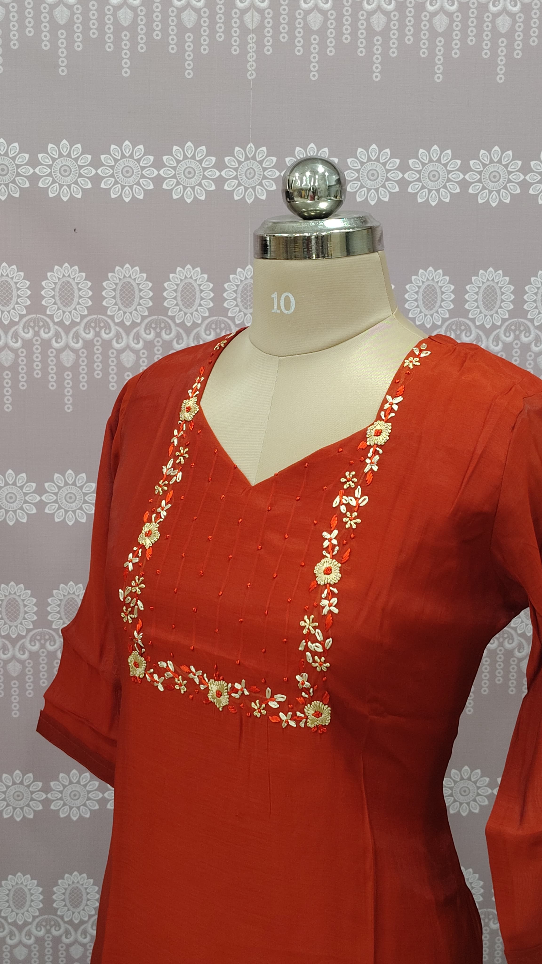 Color & Fabric: The kurthi comes in a rich rust-red (brick red) shade. The fabric appears to be a lightweight chanderi silk or a high-quality cotton-silk blend, giving it a subtle sheen and a structured drape.