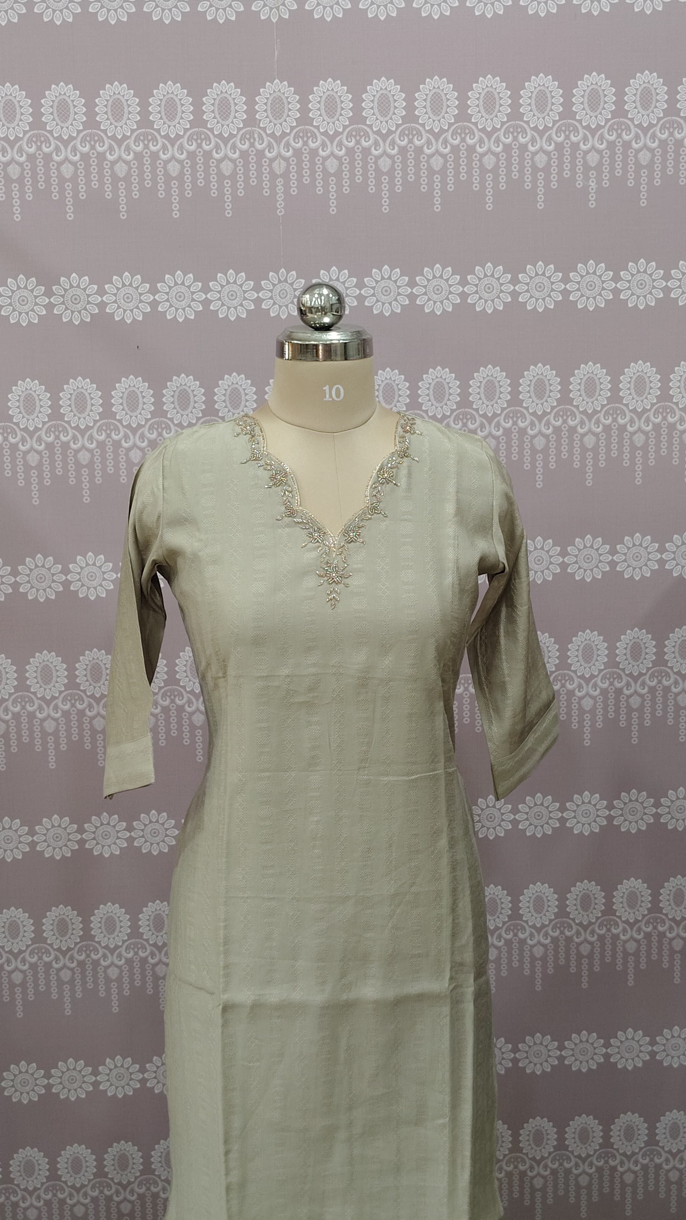 >> Design: V-neckline featuring tonal floral embroidery and subtle beadwork.