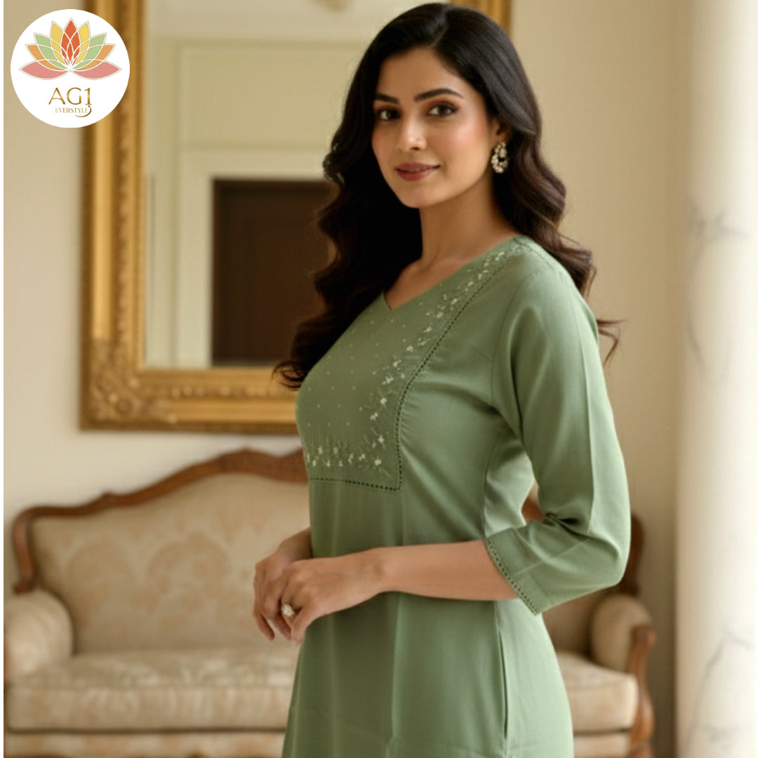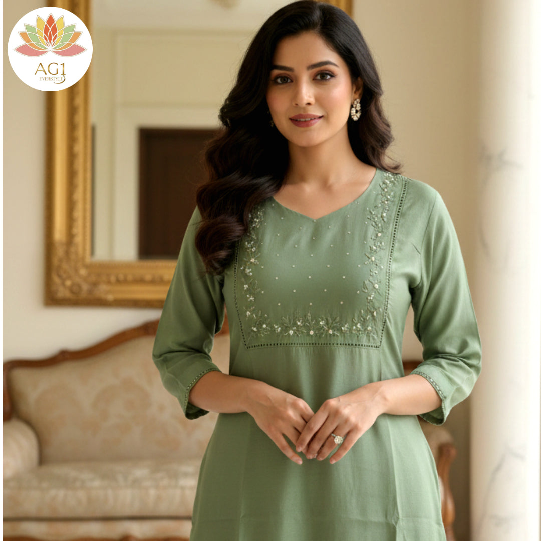 ■ Detailing: Subtle floral thread-work and sequins on the chest, bordered by a dainty lace insert.