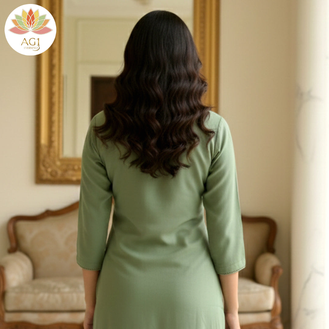 ■ Sleeves: Elegant three-quarter sleeves with a slight flare at the ends.