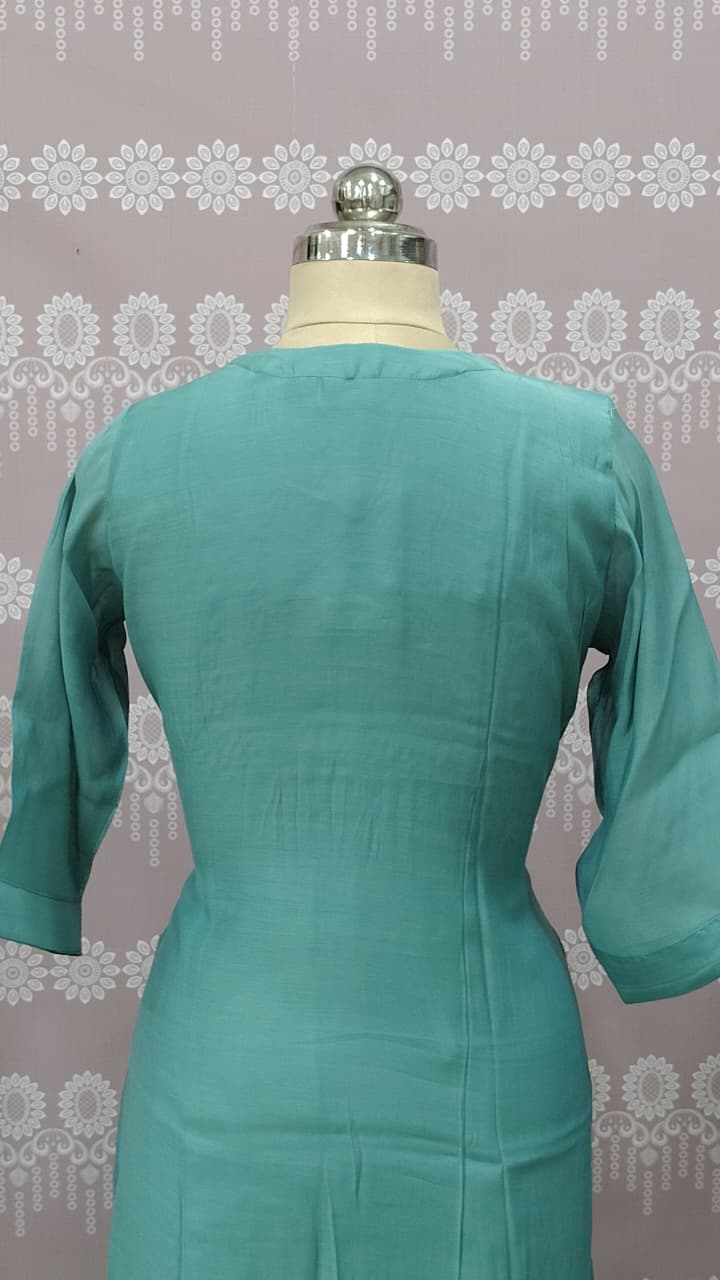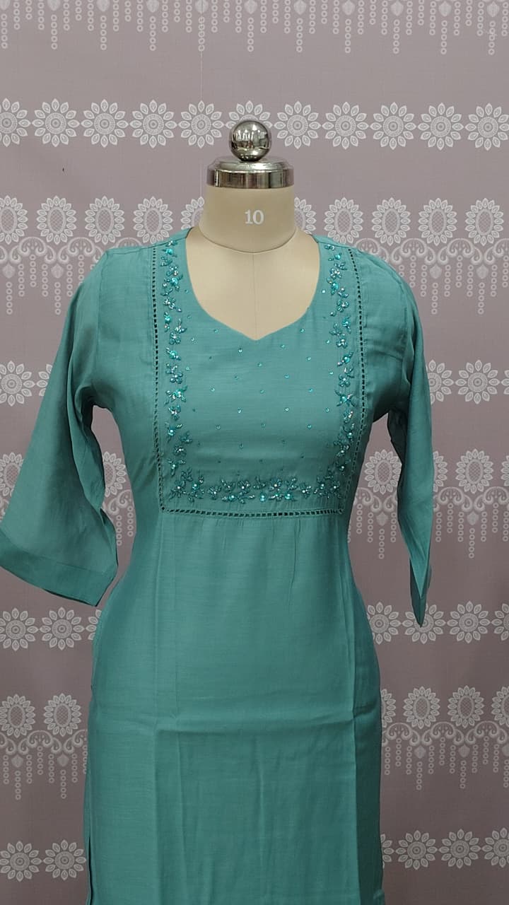 》Work: The chest features a U-shaped border of delicate floral embroidery, sequins, and tonal beads.