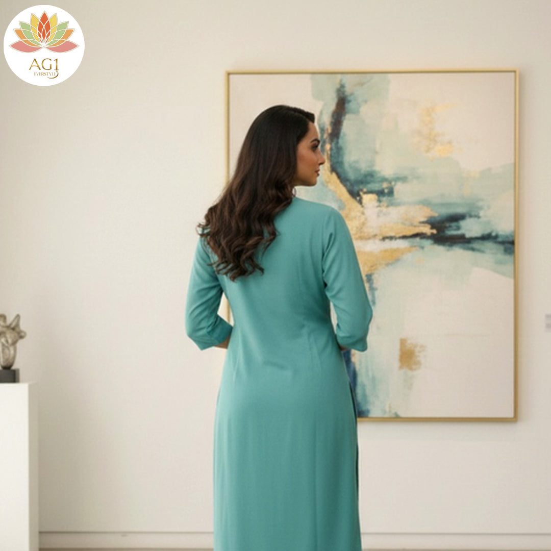》Style: Three-quarter sleeves and a rounded V-neckline.