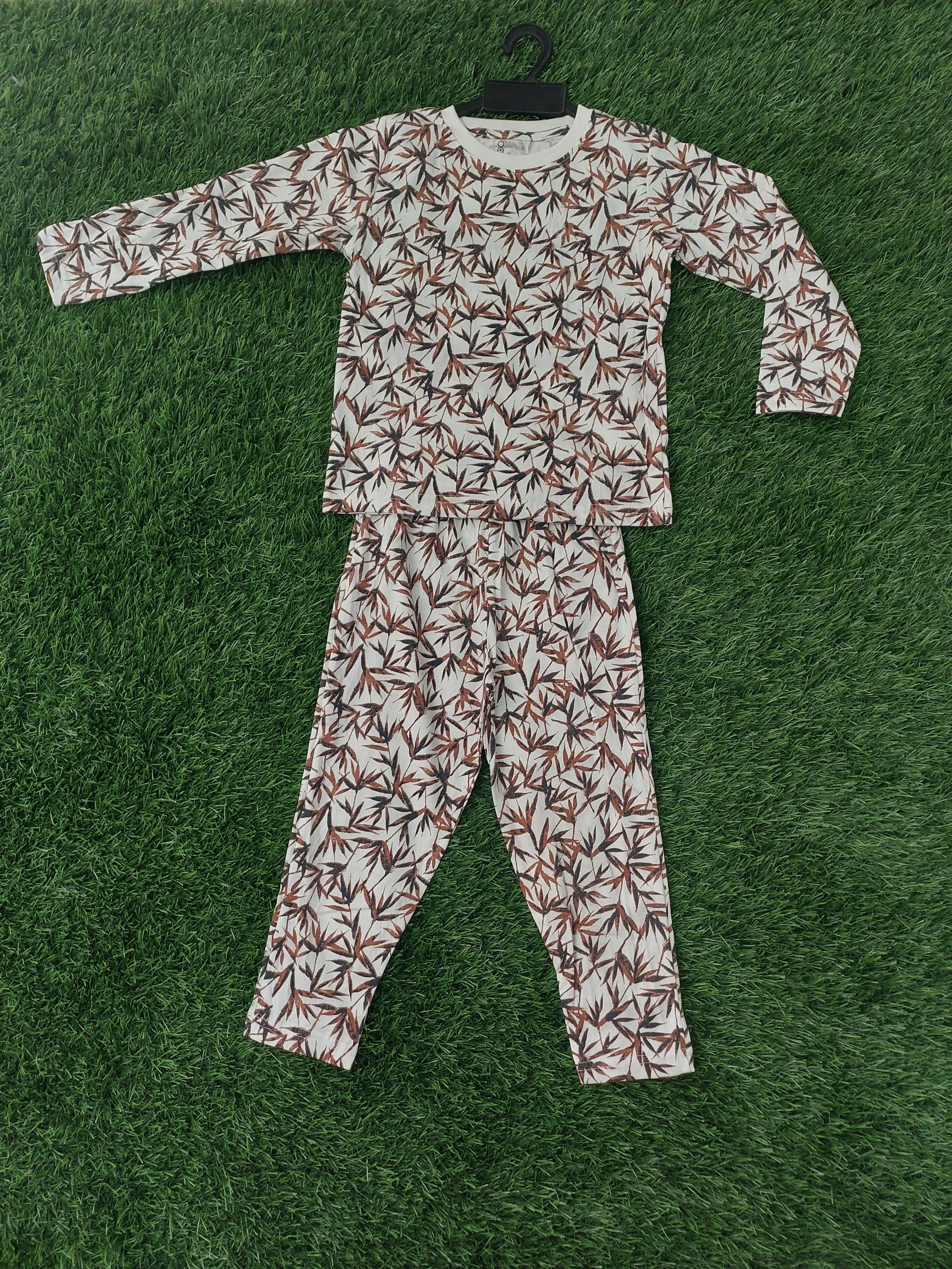 Print: An all-over botanical print consisting of stylized bamboo leaves or narrow leaf clusters. The color palette uses earthy tones—shades of rust, chocolate brown, and charcoal gray—set against a light cream or off-white background.