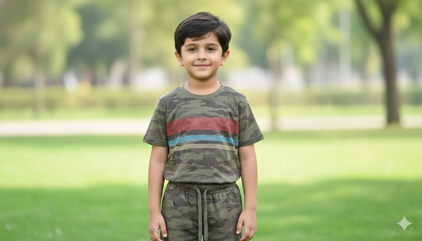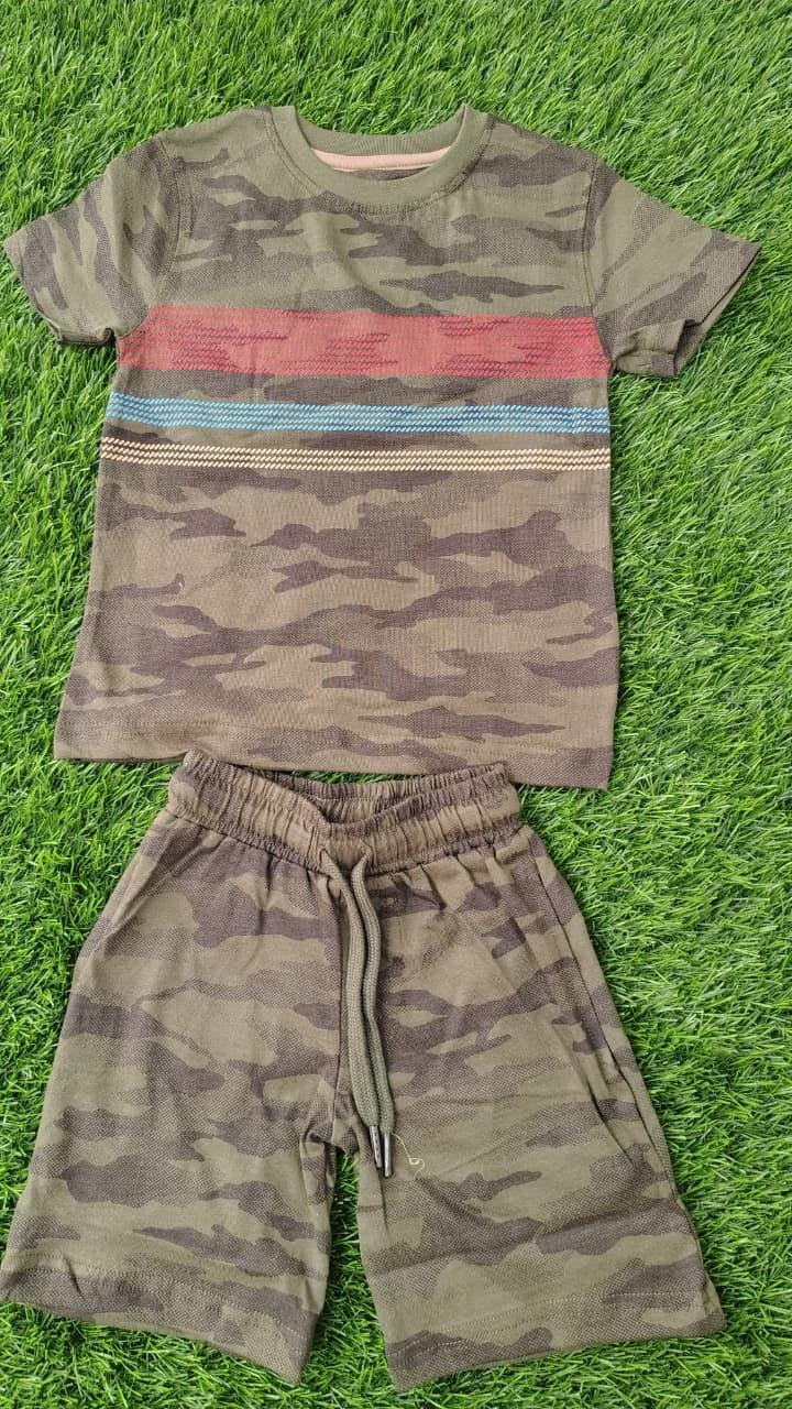 Bottom: Matching camouflage joggers (or shorts). They include a functional olive green drawstring at the waist for an adjustable fit.