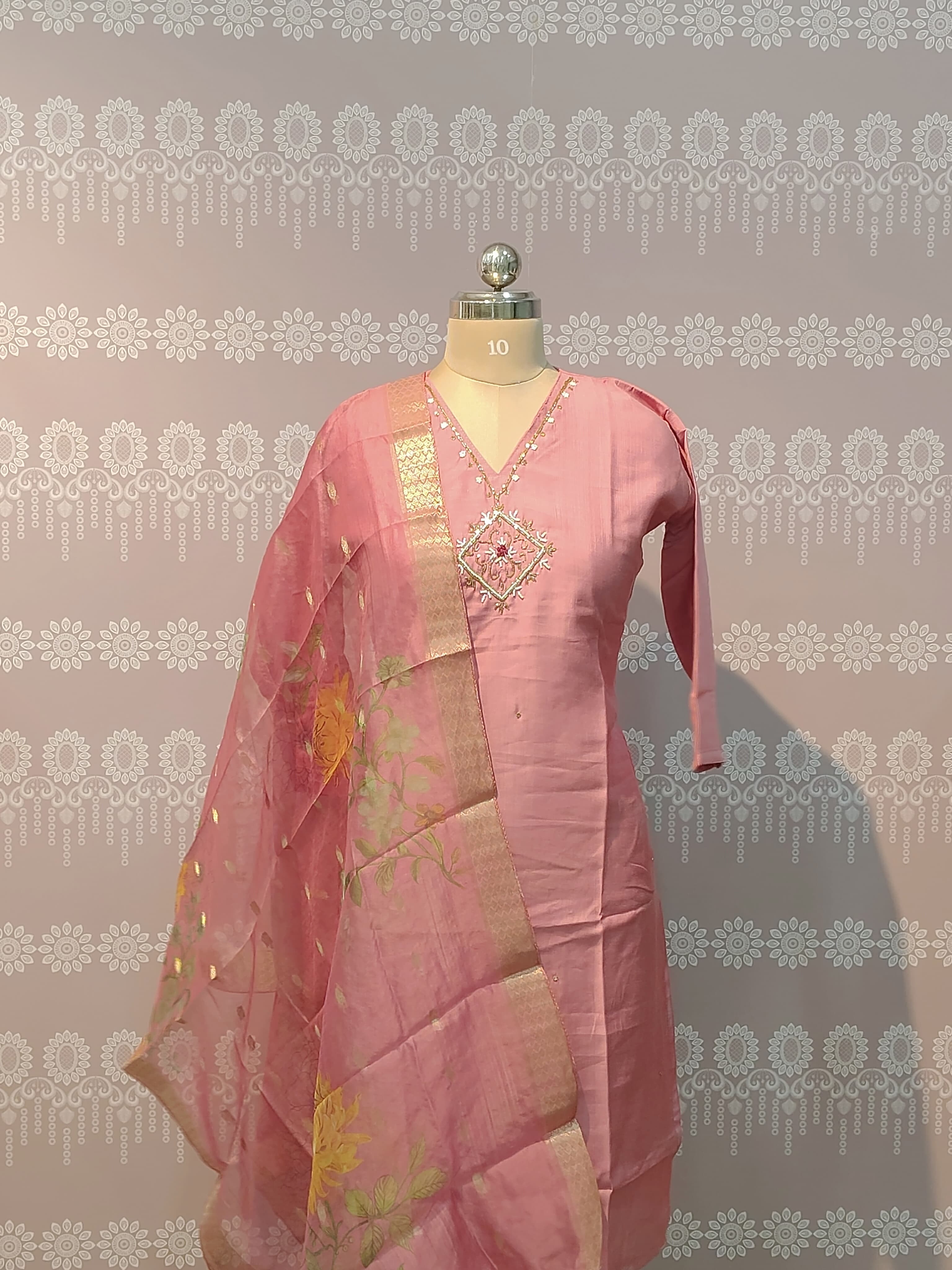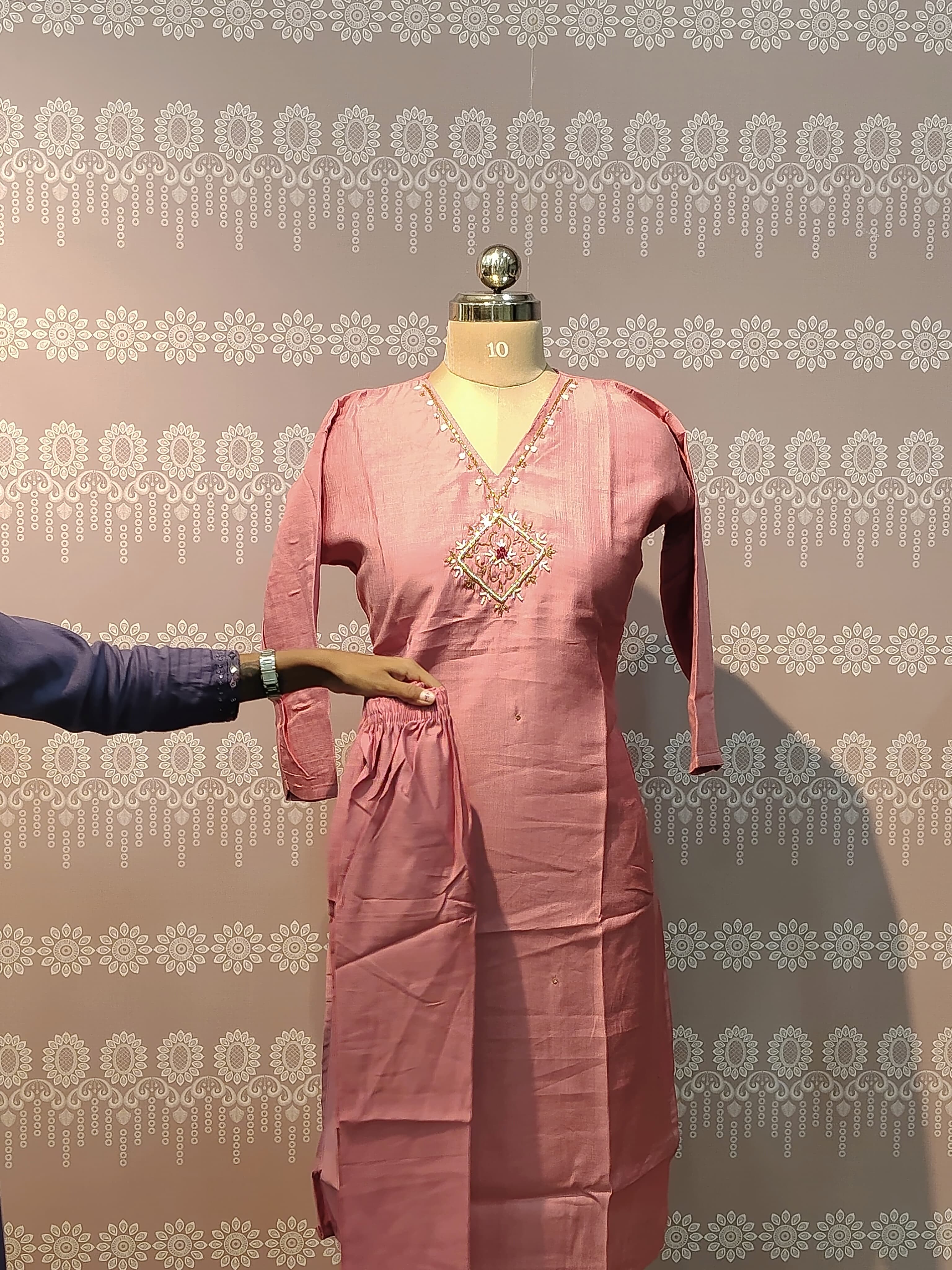 Step into timeless elegance with this soft pink ethnic suit set, crafted for effortless grace. The kurti features a refined V-neckline with delicate embroidery that adds a subtle touch of sophistication. Paired with matching straight-fit pants, the set ensures comfort without compromising on style.