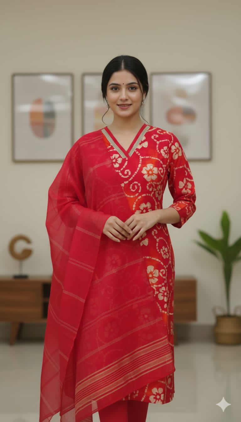 Beautiful red kurta set designed with traditional floral and swirl prints. The kurta features a stylish V-neck with contrast border detailing and three-quarter sleeves, paired with matching bottoms and a soft, lightweight dupatta with subtle stripes. Crafted from comfortable, breathable fabric, making it perfect for festive wear, casual gatherings, and ethnic occasions.