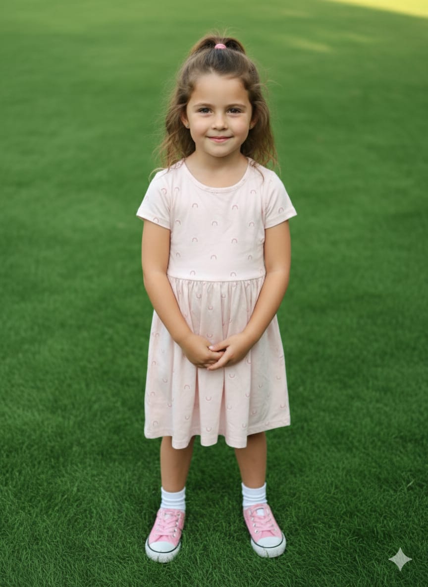 This adorable soft pink dress is perfect for everyday comfort and sweet style. Made from gentle, breathable fabric, it keeps your little girl comfortable all day long. The short sleeves and round neckline offer a classic look, while the flared skirt adds a playful touch. The subtle all-over print gives the dress a charming and elegant feel. Easy to wear and perfect for playtime, outings, or casual occasions.