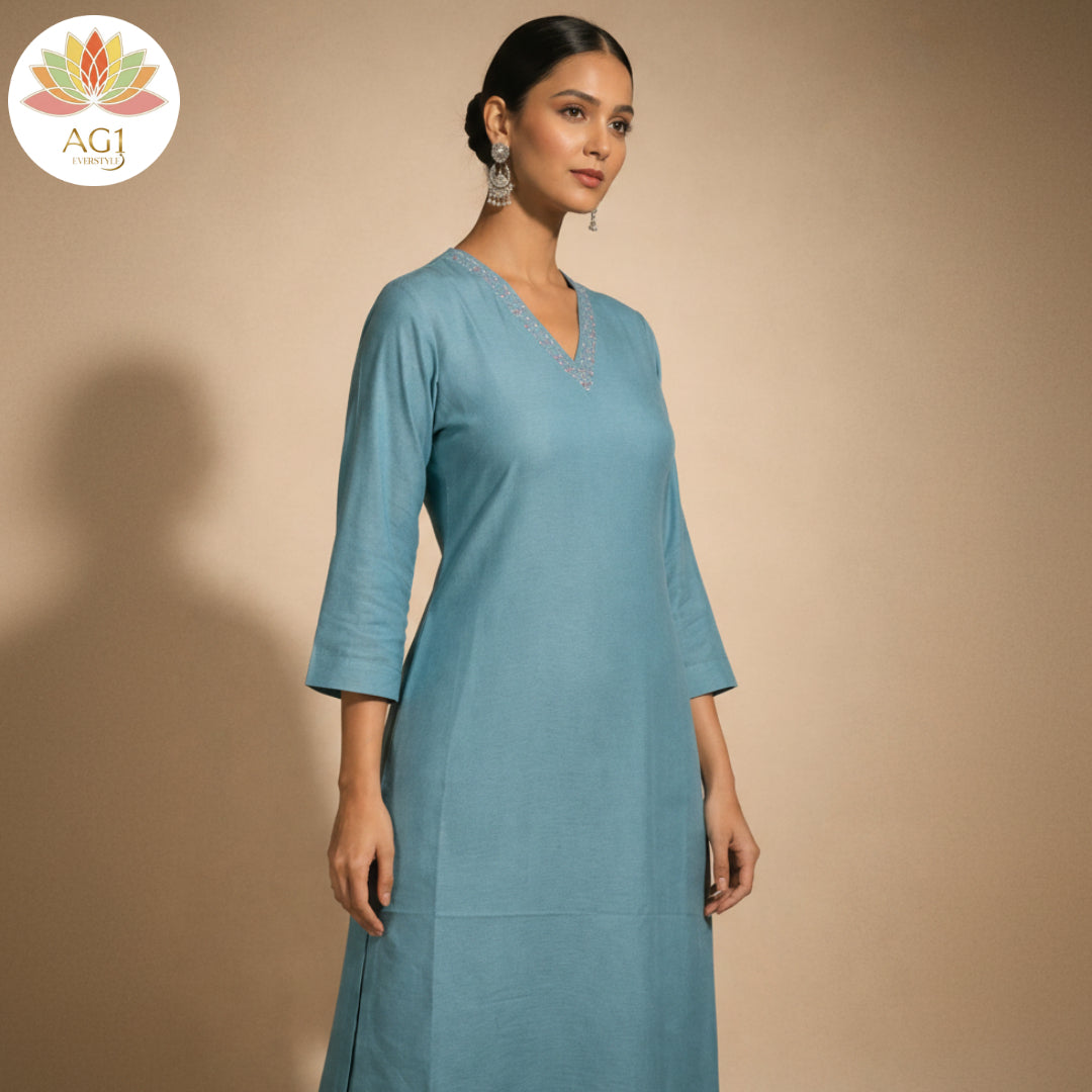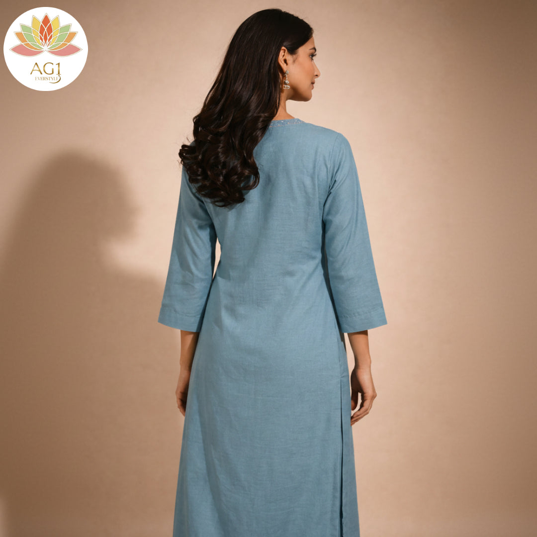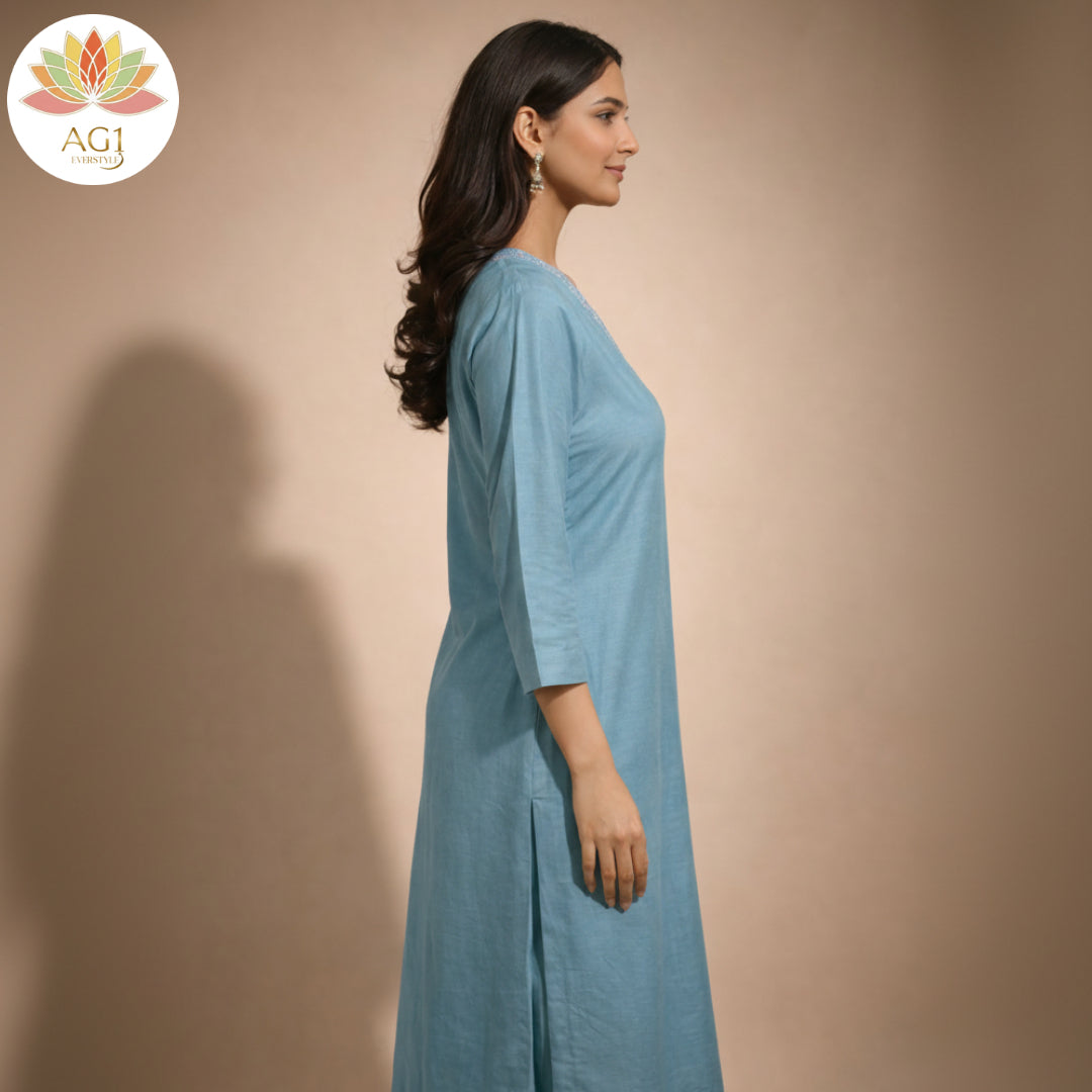 ■ Design: The kurta has a minimalist, dual-tone appearance with slightly lite bule peach side panels that provide a flattering, structured silhouette.