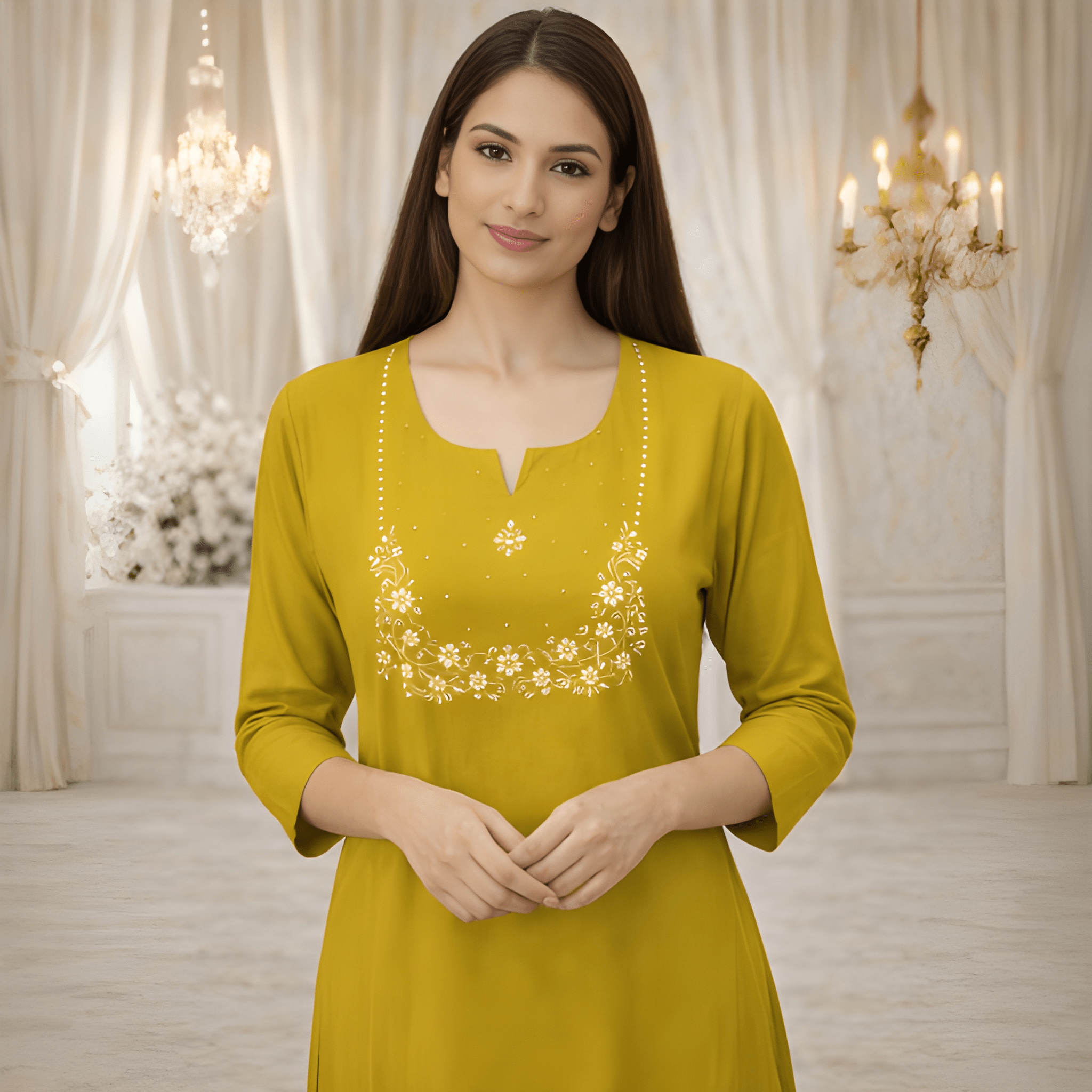 Upgrade your wardrobe with our stylish embroidery kurthi top, designed for comfort and elegance. This top is perfect for office, college, and daily wear.